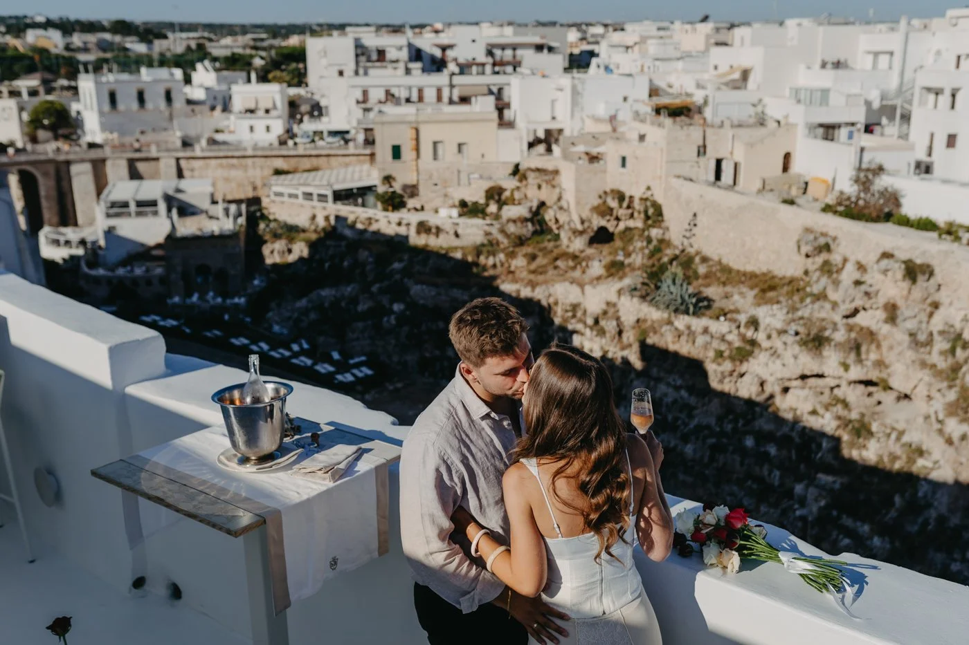 Engagement celebration rooftop Polignano a Mare champagne couple