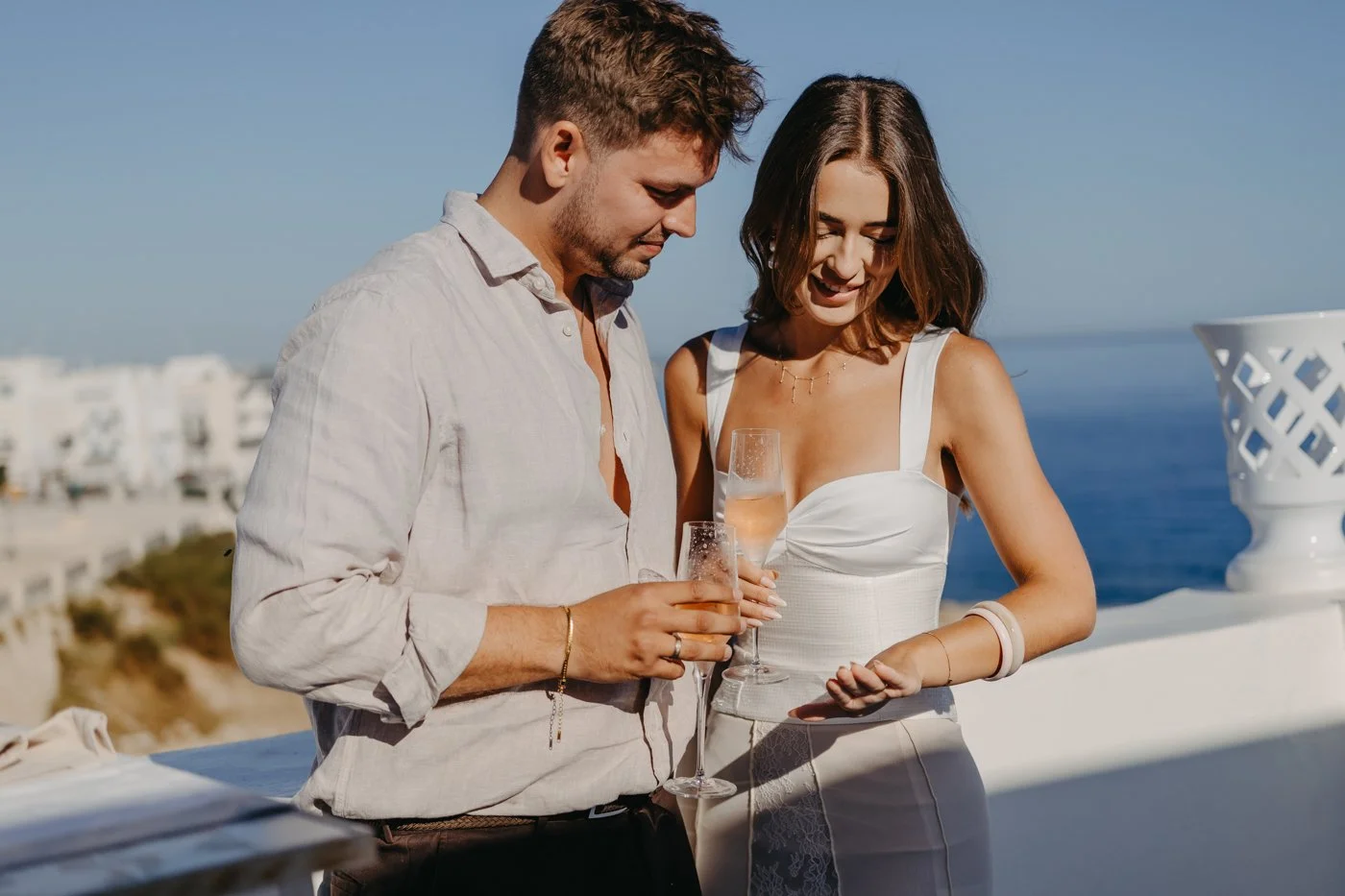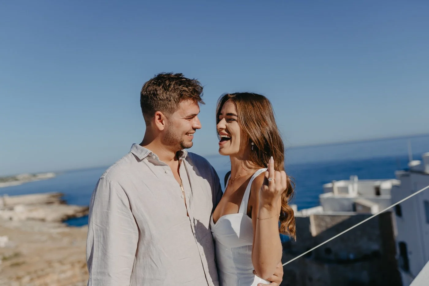 Celebrating their engagement with a glass of champagne overlooking one of the most iconic views in Puglia. After the proposal, everything became light, joyful, and spontaneous.